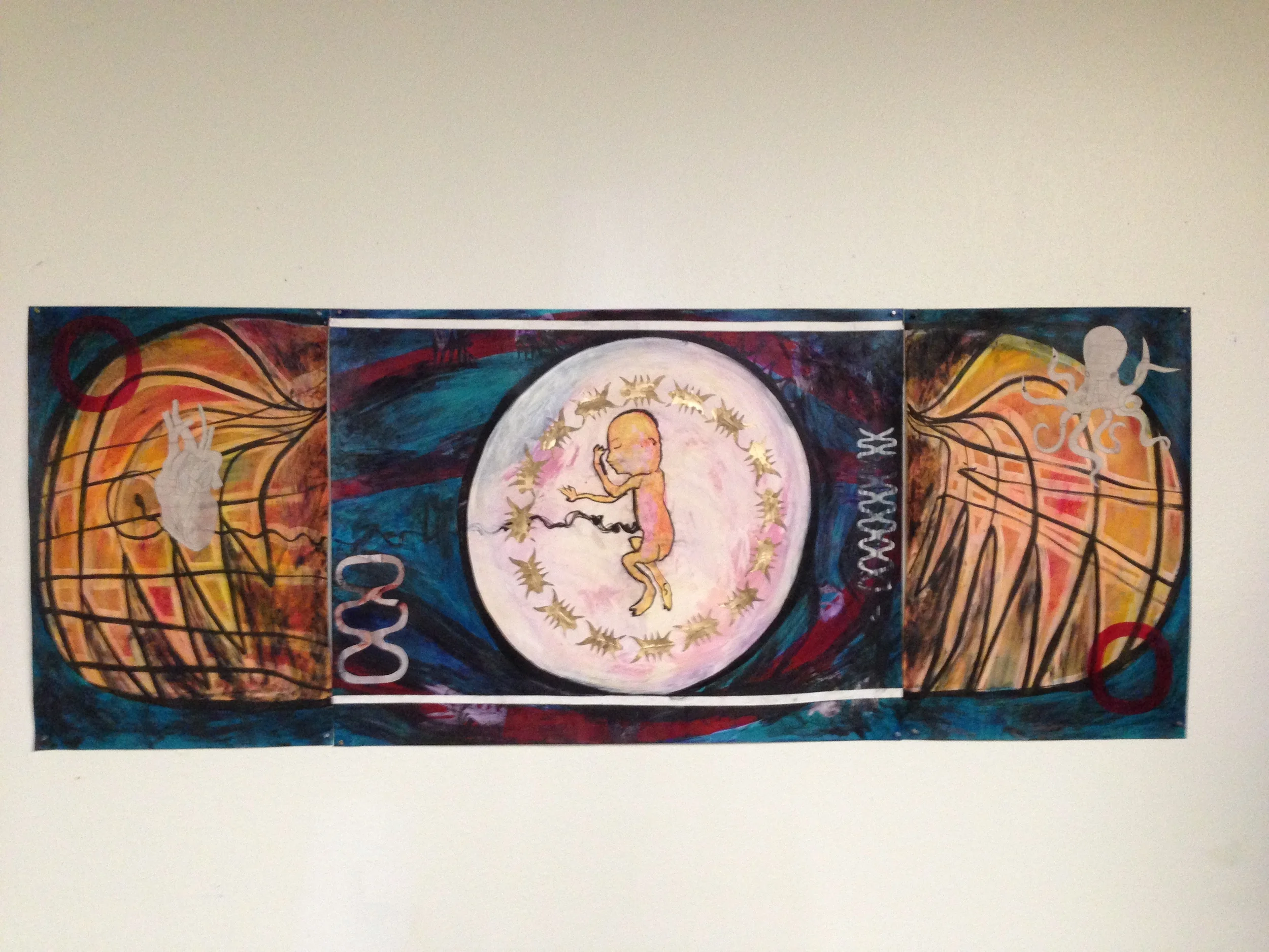 Today I have almost finished the triptych, I still need to work on the center part. I think the circle is too big and irregular in a not satisfying way. I had this idea to add a heart and an octopus as collage and see if it would finish the piece.Now I see the work almost as a flag, which country would this work for, an island nation maybe. Its such a strange process working on a drawing , each one is so totally unique in its requirements. I have learned to listen to the heart of the work and proceed sometime with caution, sometime with wild abandon .I found this quote recently