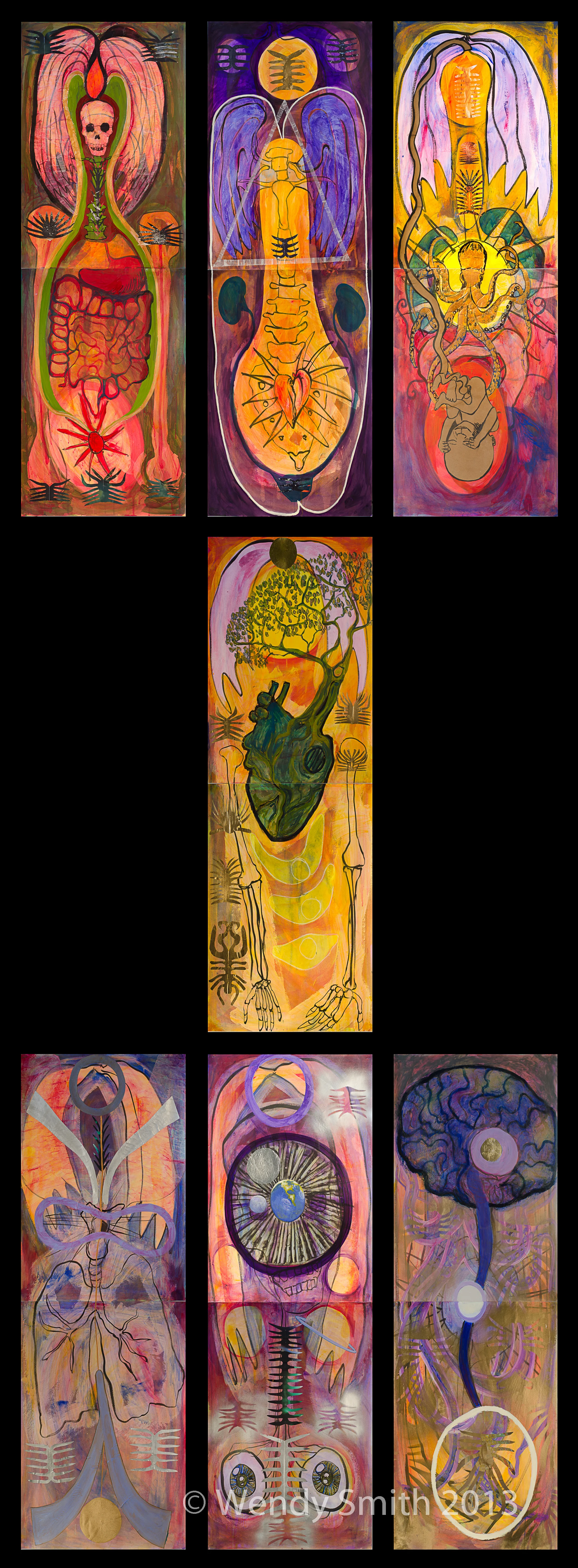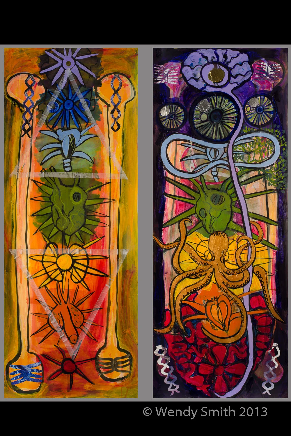 All the Chakras - Male & Female - Diptych 40"x50" Acrylic, graphite, ink, collage, metallic paint
